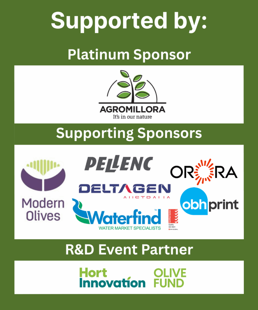 The National Olive Conference & Trade Exhibition is facilitated by the Australian Olive Association, partially funded by Hort Innovation using the Olive R&D levy, with in-kind contributions from the Australian Olive Association and funding from the Australian Government. The event is also supported by industry sponsors and exhibitors.