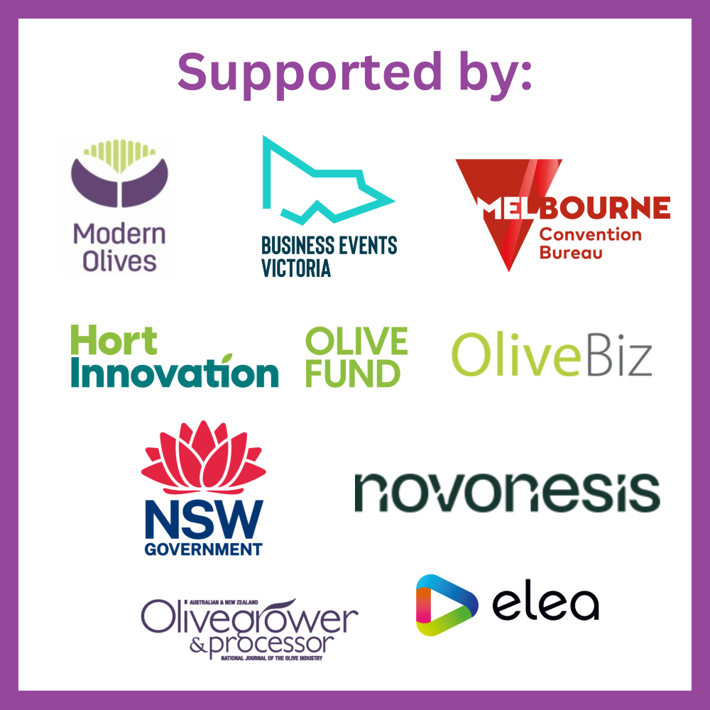 The National Olive Conference & Trade Exhibition is facilitated by the Australian Olive Association, partially funded by Hort Innovation using the Olive R&D levy, with in-kind contributions from the Australian Olive Association and funding from the Australian Government. The event is also supported by a range of industry sponsors and exhibitors, the Melbourne Convention Bureau and the Victorian Government.